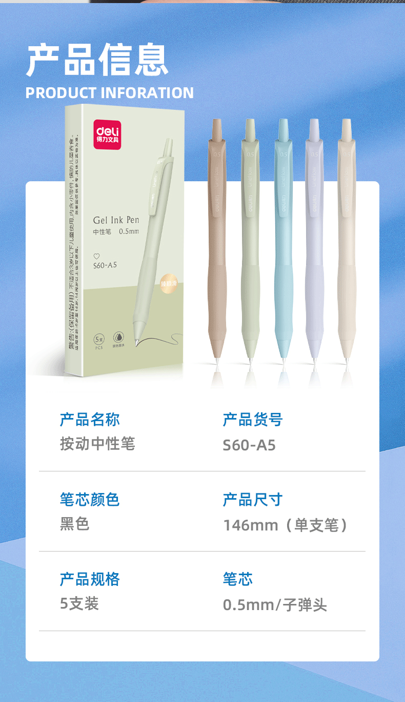 【得力S60-A5】得力(deli)弧度收口臻顺滑按动ジェルペン0.5mm子弹头黑色5支装S60-A5【行情 报价 价格 评测】-